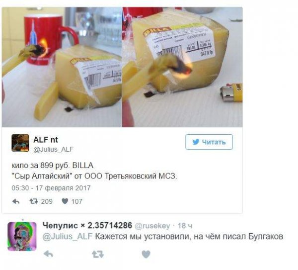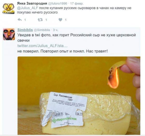 Комментаторы отреагировали на фото, обрадовавшись двойной пользе от российского сыра, которым "можно наесться и разжечь костер".