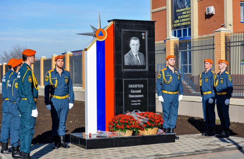 Собравшиеся возложили цветы к стеле. Улица им. Евгения Зиничева примыкает к Главному управлению МЧС России по ЧР и пожарно-спасательной части №1 по охране Ахматовского района. Стела представляет собой мраморную плиту с портретом Евгения Николаевича Зиничева.