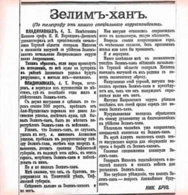 Владикавказ, 4. Х. Вчера вечером я вернулся из путешествия по местам, где в последние годы жил и действовал Зелим-Хан. С двумя ингушами я ездил по горам свыше 200 верст, проехал весь Ахи-Юртинский перевал, всё дикое Ассинское ущелье, посетил аулы, где бывал Зелим-Хан, был на месте перестрелки Зелим-Хана с войсками.