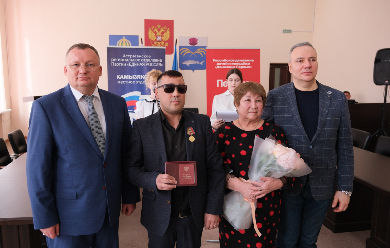 В тот же день в Камызякском районе произошло еще одно торжественное событие. Юные камызякцы не только получили свой главный в жизни документ, но и встретились с настоящим патриотом своей страны, истинным защитником Родины - участником специальной военной операции Рафаэлем Мухамбетовым. За мужество, отвагу и самоотверженность Игорь Мартынов вручил герою очередную медаль «За храбрость» I степени.