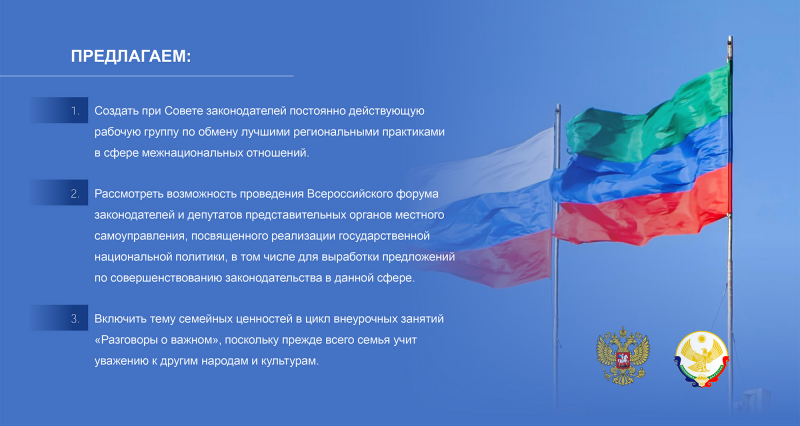 Одним из предложений Заура Аскендерова стало создание при Совете законодателей РФ постоянно действующей рабочей группы, которая займется обменом лучшими региональными практиками в сфере межнациональных отношений.